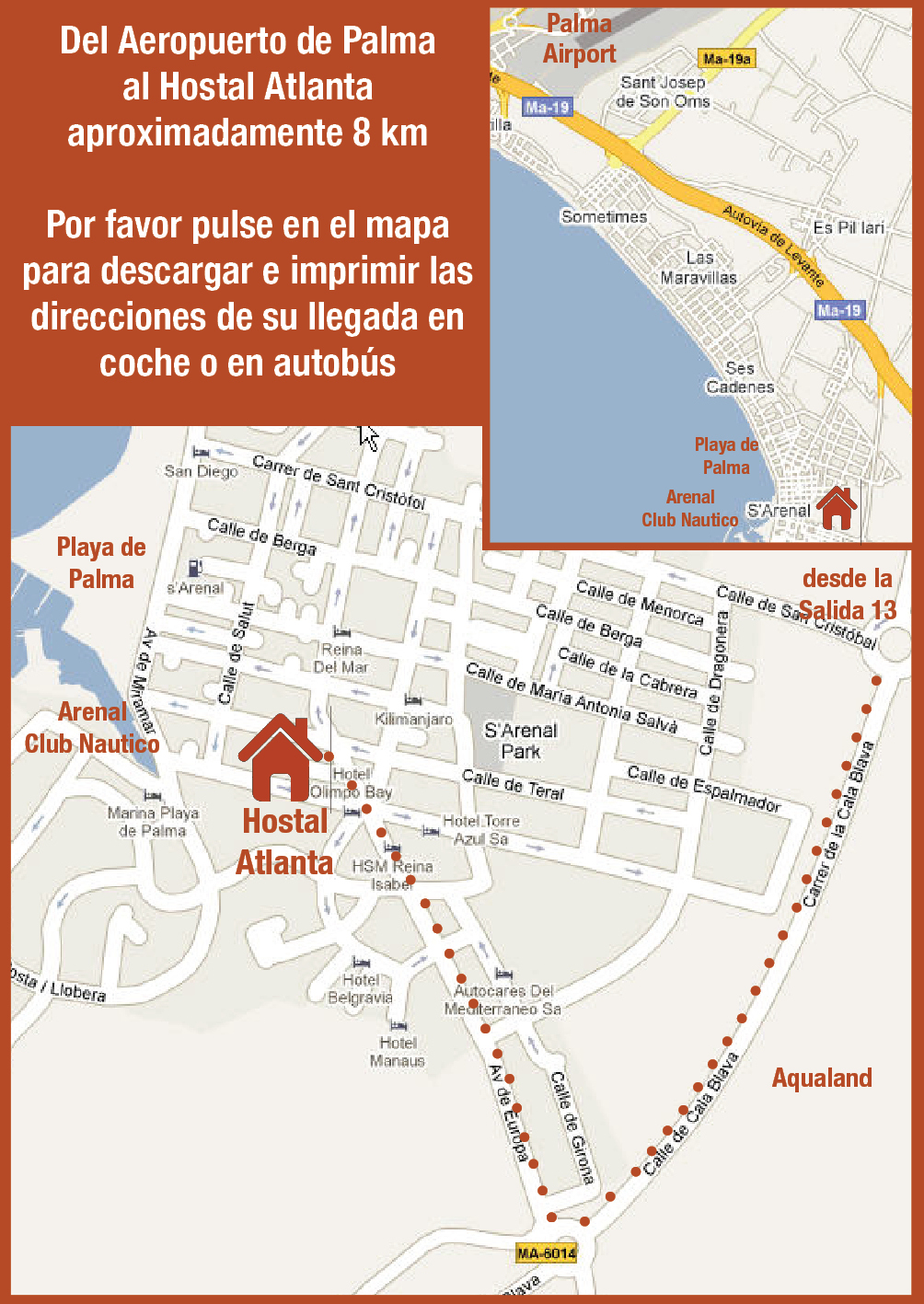 El hostal Atlanta está ubicado a tan sólo10min en coche del aeropuerto, en la concurrida zona de El Arenal, con su gran variedad de bares, restaurantes y discotecas. Menos de 5 minutos a pie le llevará a la Playa de Playa, una playa con bandera azul que se extiende a 4 kilómetros, con un atractivo paseo marítimo para pasear.
